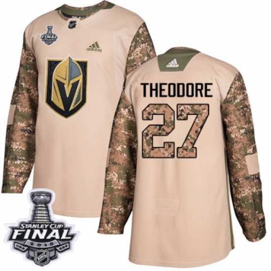 >Men's Adidas Vegas Golden Knights #27 Shea Theodore Authentic Camo Veterans Day Practice 2018 Stanley Cup Final NHL Jersey