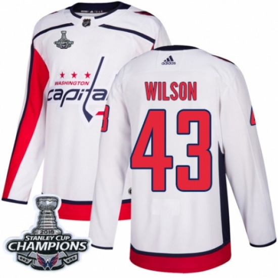 >Men's Adidas Washington Capitals #43 Tom Wilson Authentic White Away 2018 Stanley Cup Final Champions NHL Jersey