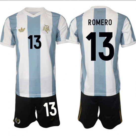 >Men's Argentina #13 Cristian Romero White Blue 2024-25 50th Anniversary Home Soccer Jersey Suit