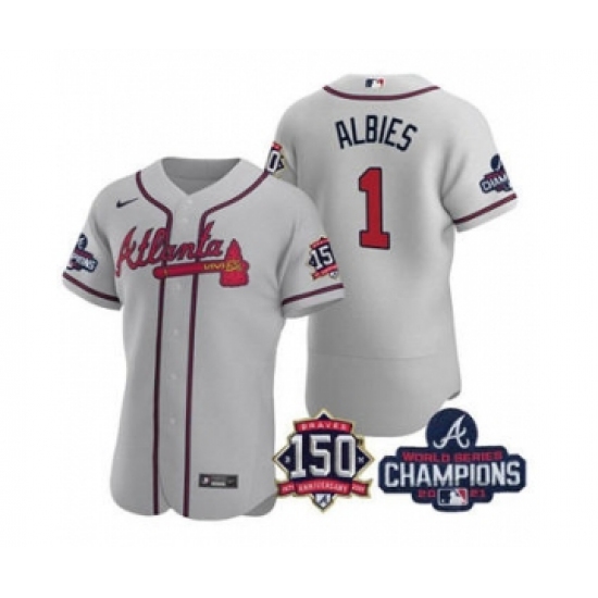 Men's Atlanta Braves #1 Ozzie Albies 2021 Gray World Series Champions With 150th Anniversary Flex Base Stitched Jersey