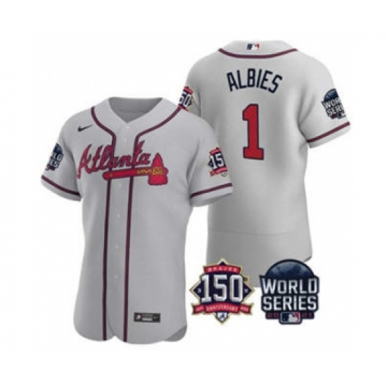 Men's Atlanta Braves #1 Ozzie Albies 2021 Gray World Series Flex Base With 150th Anniversary Patch Baseball Jersey