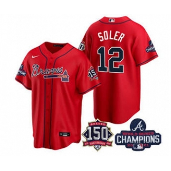 >Men's Atlanta Braves #12 Jorge Soler 2021 Red World Series Champions With 150th Anniversary Patch Cool Base Stitched Jersey