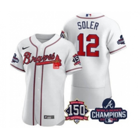 Men's Atlanta Braves #12 Jorge Soler 2021 White World Series Champions With 150th Anniversary Flex Base Stitched Jersey