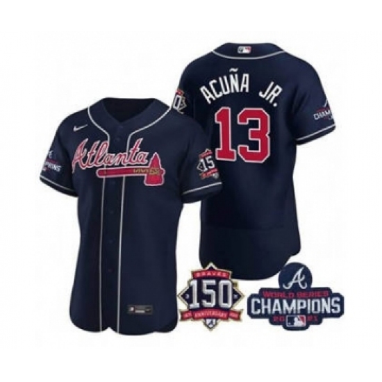 Men's Atlanta Braves #13 Ronald Acuna Jr. 2021 Navy World Series Champions With 150th Anniversary Flex Base Stitched Jersey
