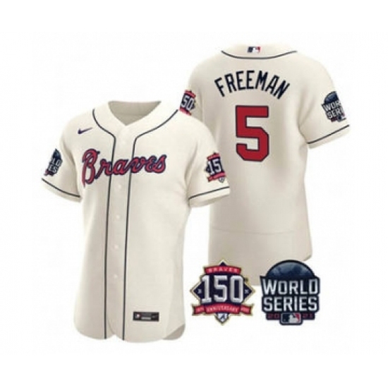 Men's Atlanta Braves #5 Freddie Freeman 2021 Cream World Series Flex Base With 150th Anniversary Patch Baseball Jersey