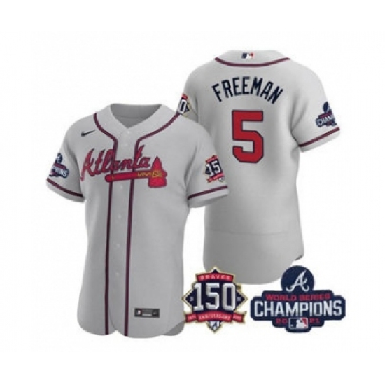 Men's Atlanta Braves #5 Freddie Freeman 2021 Gray World Series Champions With 150th Anniversary Flex Base Stitched Jersey