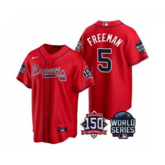 Men's Atlanta Braves #5 Freddie Freeman 2021 Red World Series With 150th Anniversary Patch Cool Base Baseball Jersey