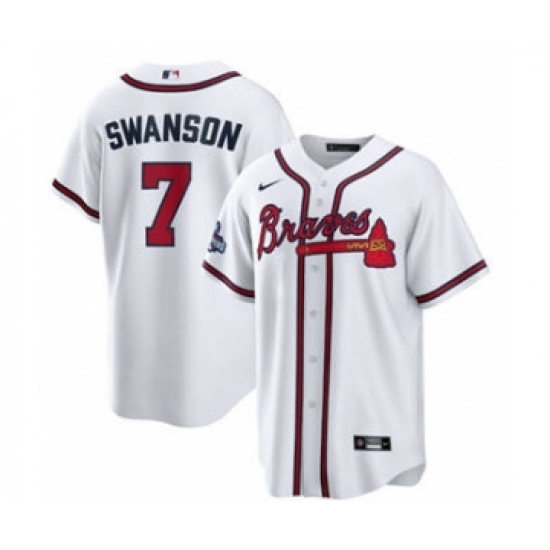 >Men's Atlanta Braves #7 Dansby Swanson 2021 White World Series Champions Cool Base Stitched Jersey