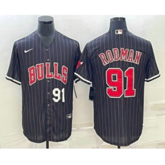 Men's Chicago Bulls #91 Dennis Rodman Black Pinstripe With Patch Cool Base Stitched Baseball Jersey