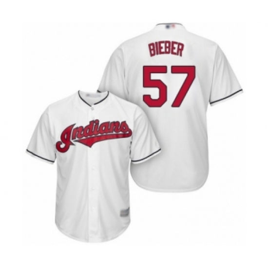 >Men's Cleveland Indians #57 Shane Bieber Replica White Home Cool Base Baseball Jersey
