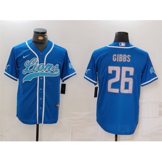 >Men's Detroit Lions #26 Jahmyr Gibbs Blue Cool Base Stitched Baseball Jersey