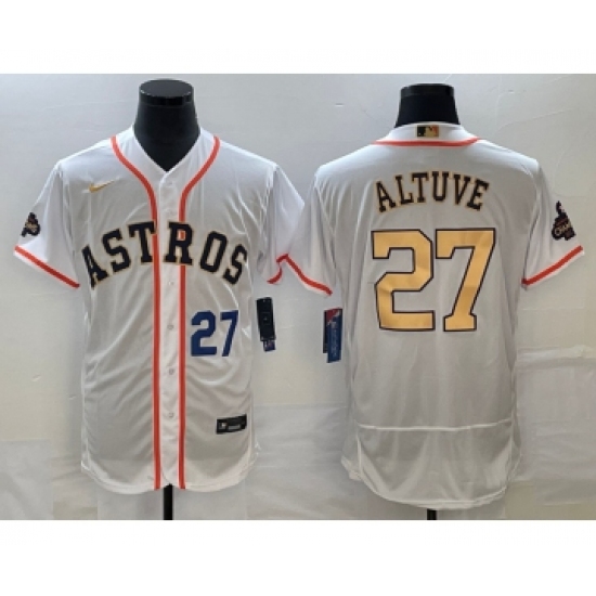 Men's Houston Astros #27 Jose Altuve Number 2023 White Gold World Serise Champions Flex Base Stitched Jersey1