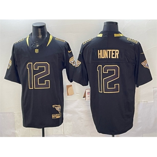 >Men's Jacksonville Jaguars #12 Travis Hunter Black Gold 2025 F.U.S.E. With Vapor Untouchable Limited Stitched Jersey