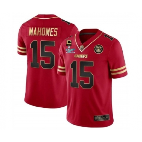 >Men’s Kansas City Chiefs #15 Patrick Mahomes Red Gold Super Bowl LVII Patch And 4-star C Patch Vapor Untouchable Limited Stitched Jersey