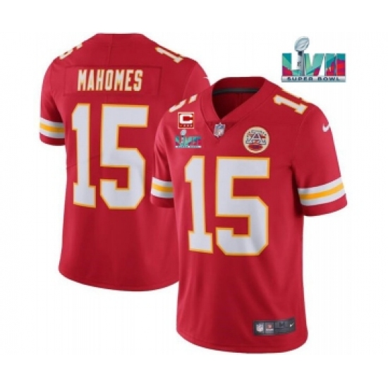 >Men’s Kansas City Chiefs #15 Patrick Mahomes Red Super Bowl LVII Patch And 4-star C Patch Vapor Untouchable Limited Stitched Jersey