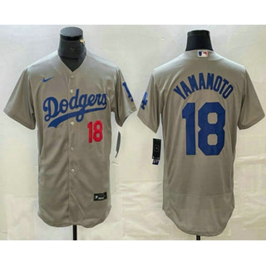 >Men's Los Angeles Dodgers #18 Yoshinobu Yamamoto Number Grey Stitched Flex Base Nike Jersey