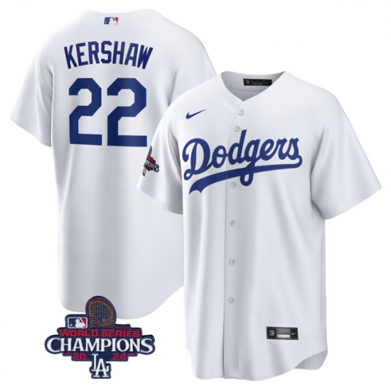 Men's Los Angeles Dodgers #22 Clayton Kershaw White 2024 World Series Champions Cool Base Stitched Baseball Jersey