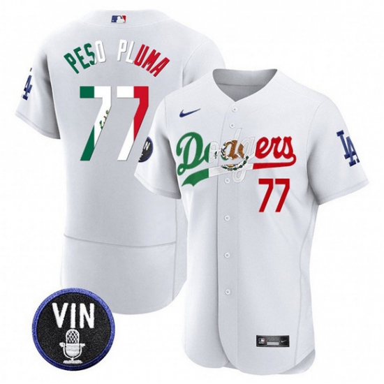 Men's Los Angeles Dodgers #77 Pezo Pluma White Mexico Special Vin Scully Flex Base Stitched Baseball Jersey
