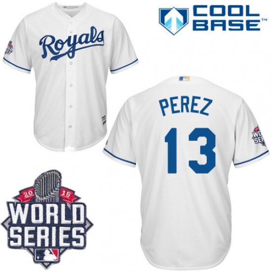 Home>MLB>Kansas City Royals>Salvador Perez>Men's Majestic Kansas City Royals #13 Salvador Perez Replica White Home Cool Base 2015 World Series