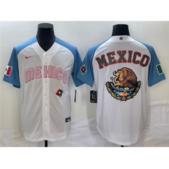>Men's Mexico Baseball 2023 White Blue Team Big Logo World Baseball Classic Stitched Jersey