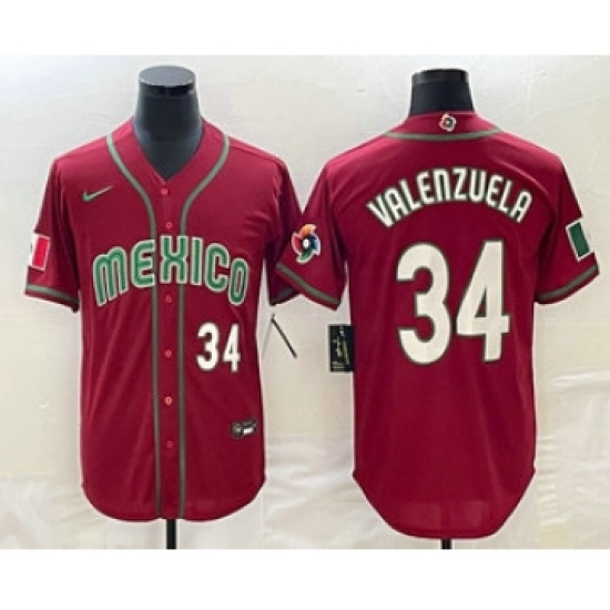 >Men's Mexico Baseball #34 Fernando Valenzuela Number 2023 Red Blue World Baseball Classic Stitched Jersey2