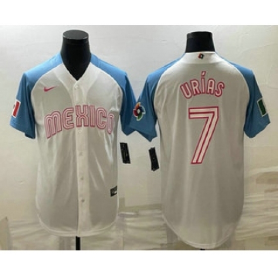 Men's Mexico Baseball #7 Julio Urias 2023 White Blue World Classic Stitched Jersey7