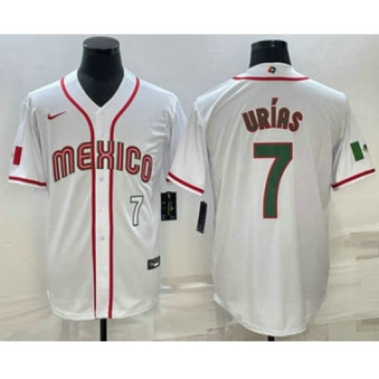 >Mens Mexico Baseball #7 Julio Urias Number 2023 White Blue World Baseball Classic Stitched Jersey