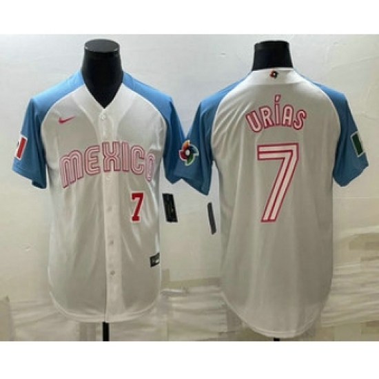 Men's Mexico Baseball #7 Julio Urias 2023 White Blue World Classic Stitched Jersey7