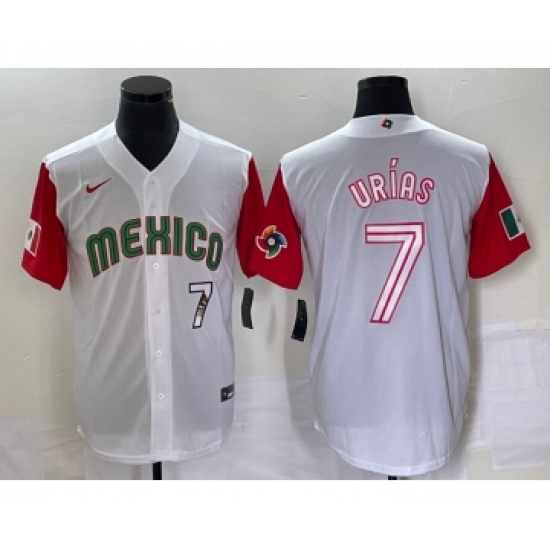 >Men's Mexico Baseball #7 Julio Urias Number 2023 White Red World Classic Stitched Jersey 45