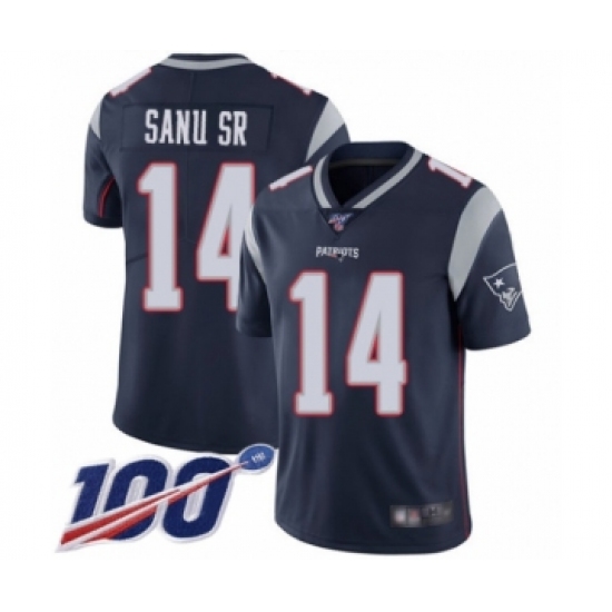 >Men's New England Patriots #14 Mohamed Sanu Sr Navy Blue Team Color Vapor Untouchable Limited Player 100th Season Football Jersey