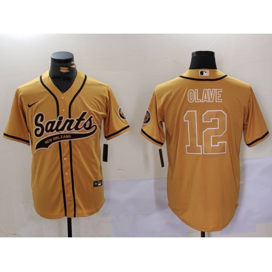 >Men's New Orleans Saints #12 Chris Olave Gold Cool Base Stitched Baseball Jersey