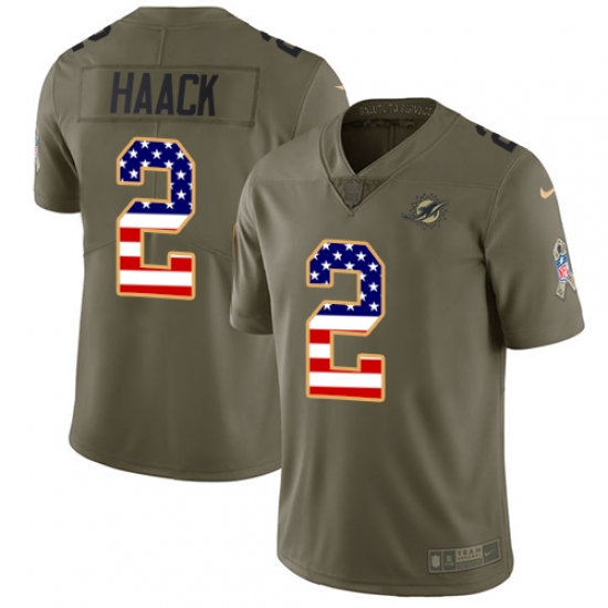 >Men's Nike Miami Dolphins #2 Matt Haack Limited Olive USA Flag 2017 Salute to Service NFL Jersey