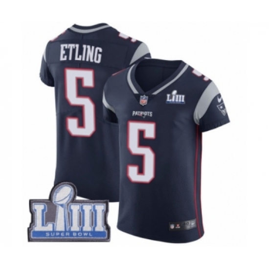>Men's Nike New England Patriots #5 Danny Etling Navy Blue Team Color Vapor Untouchable Elite Player Super Bowl LIII Bound NFL Jersey