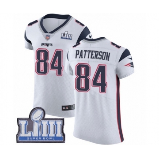 >Men's Nike New England Patriots #84 Cordarrelle Patterson White Vapor Untouchable Elite Player Super Bowl LIII Bound NFL Jersey