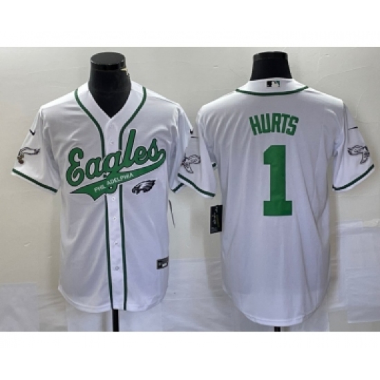 Men's Nike Philadelphia Eagles #1 Jalen Hurts White Cool Base Stitched Baseball Jersey