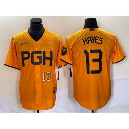 >Men's Nike Pittsburgh Pirates #13 KeBryan Hayes Number Gold 2023 City Connect Stitched Jersey2