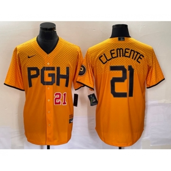 >Men's Nike Pittsburgh Pirates #21 Roberto Clemente Number Gold 2023 City Connect Stitched Jersey