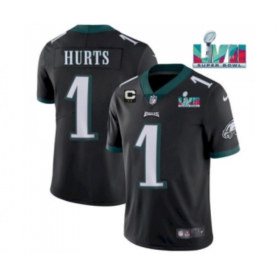 >Men's Philadelphia Eagles #1 Jalen Hurts Black Super Bowl LVII Patch And 2-star C Patch Vapor Untouchable Limited Stitched Jersey