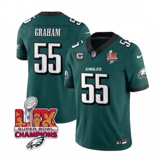 >Men's Philadelphia Eagles #55 Brandon Graham Green 2025 Eagles Logo Super Bowl LIX And 4-Star C New F.U.S.E. Vapor Limited Football Stitched Jersey