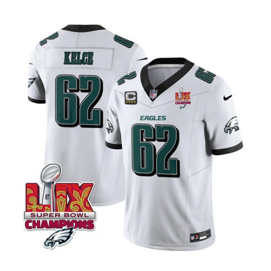 >Men's Philadelphia Eagles #62 Jason Kelce White 2025 Eagles Logo Super Bowl And 4-Star C New F.U.S.E. Vapor Limited Football Stitched Jersey