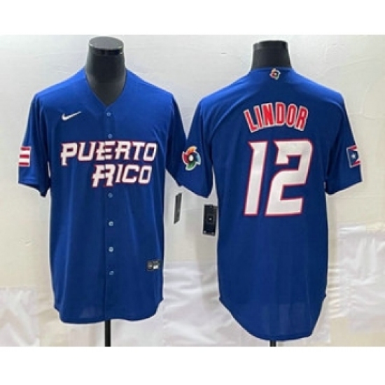 >Men's Puerto Rico Baseball #12 Francisco Lindor 2023 Royal World Classic Stitched Jerseys