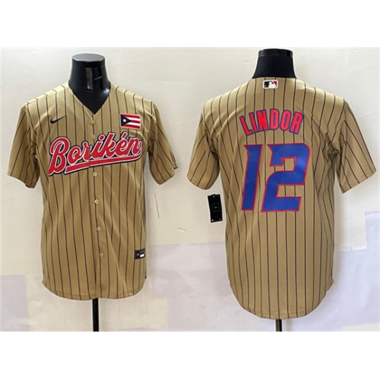 >Men's Puerto Rico Baseball #12 Francisco Lindor Tan 2023 World Baseball Classic Stitched Jersey