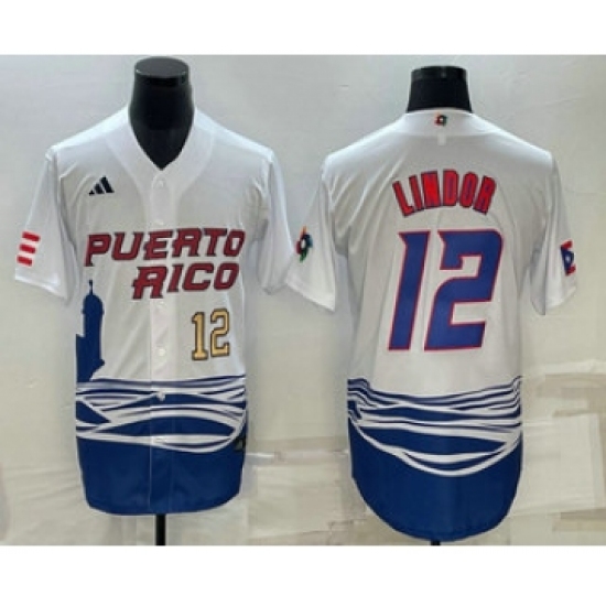 Men's Puerto Rico Baseball #12 Francisco Lindor 2023 Royal World Classic Stitched Jerseys