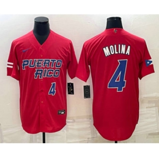 >Mens Puerto Rico Baseball #4 Yadier Molina Number 2023 Red World Baseball Classic Stitched Jersey