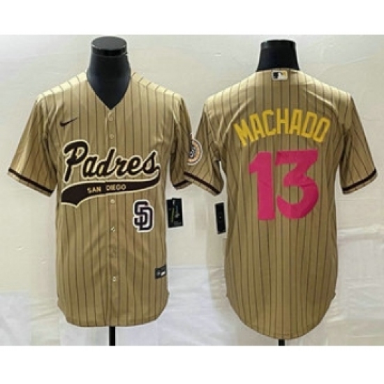 Men's San Diego Padres #13 Manny Machado Tan Pinstripe 2023 City Connect Cool Base Stitched Jersey 1