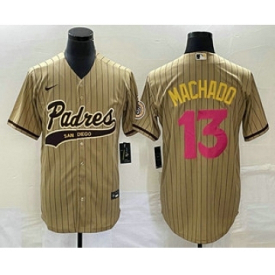 >Men's San Diego Padres #13 Manny Machado Tan Pinstripe 2023 City Connect Cool Base Stitched Jersey