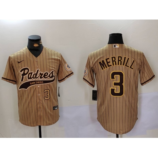 >Men's San Diego Padres #3 Jackson Merrill Tan 2023 Cool Base Stitched Jerseys