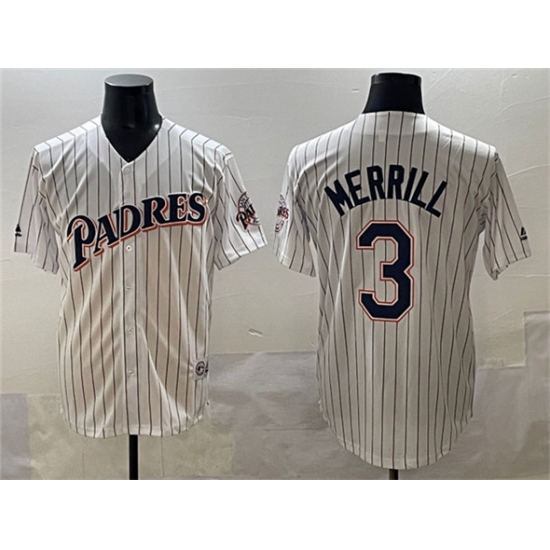 >Men's San Diego Padres #3 Jackson Merrill White Throwback With Cool Base Stitched Baseball Jersey
