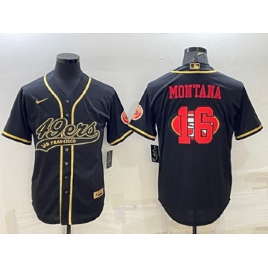 >Men's San Francisco 49ers #16 Joe Montana Black Gold Team Big Logo With Patch Cool Base Stitched Baseball Jersey