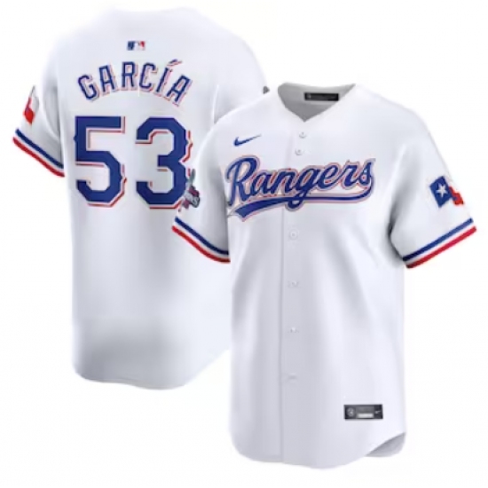 Men's Texas Rangers #53 Adolis García Nike White Home 2023 World Series Champions Limited Jersey